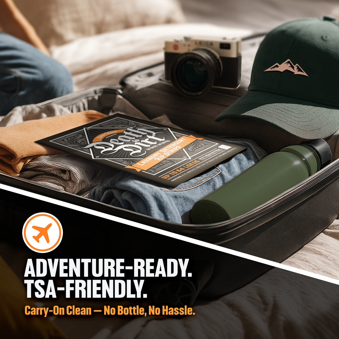Heavy jugs and leaky bottles have no place in your suitcase. Death to Dirt R.I.P. Strips let you pack smarter and wash easier, no matter where the road takes you.